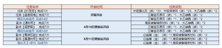 周年庆福利活动: CDK内含:跳跳糖(绑)*50、完美修理宝石(绑)*30、高阶装备精炼材料(绑)*2、二阶炎阳火(绑)*10、四等宝石原石(绑)*1 CDK:开服后公布 CDK时间:开服后~3月31日 23:59 月度福利活动大升级: 福利一:每周的CDK都将为你奉上强化保底与打孔道具(1)开服后~3月22日23:59周周福利(第1周):中级强化石(绑)*10、中级保底符(绑定)*10、金刚锥(绑)*5、疯狂薯片(绑)*10CDK码:即将开放(2)3月23日更新后~3月29日23:59周周福利(第2周):中级强化石(绑)*10、中级保底符(绑定)*10、金刚锥(绑)*5、疯狂薯片(绑)*10CDK码:即将开放(3)3月30日更新后~4月5日23:59周周福利(第3周):中级强化石(绑)*10、中级保底符(绑定)*10、金刚锥(绑)*5、疯狂薯片(绑)*10CDK码:即将开放(4)4月6日更新后~4月12日23:59周周福利(第4周):中级强化石(绑)*10、中级保底符(绑定)*10、金刚锥(绑)*5、疯狂薯片(绑)*10CDK码:即将开放福利二:月度任务宝石稳定获取,蓝晶绿晶,疯狂放送,海量熟练度材料,助你稳步提升。 注:幻幽草(金)奖励时间非70版本开放时间,6月8日更新维护后将开放二期福利活动,奖励敬请期待! 【玉兔妹妹的惊喜活动】活动一:惊喜天罡星图活动活动NPC:周周任务奖励? 玉兔妹妹(2541,874)活动等级:45级活动内容:上交小金币包1个(该任务每周可以完成5次)任务奖励:一阶炎阳火(绑)2个、一阶玄阴水(绑)1个、特别提货卡(绑)*1特别提货卡(绑)*10? ?可以兑换 三等宝石原石(绑)*1!该活动仅开放2周,2周后关闭小金币包售价2金币,可由NPC玉兔妹妹购买 经典活动【天马团来袭】,马年周年庆-琼华宫专属活动:属于我们青春的故事,再度开放! 活动一:捕捉天马任务1:下界的天马活动时间:开服后~3月22日23:59任务内容:在下界的天官处花费1银购买道具脖铃环,对天马使用脖铃环,有概率捕获天马,提交给下界的天官任务2:全民奖励任务内容:在整个服务器抓捕的天马数量达到了一万,这个奖励就会给予服务器中的所有玩家。在整个活动中捕捉天马的数量排在前五名,将会有额外的奖励。【注意:奖励点击调查即可领取】任务奖励:新年全民礼包1、杰出贡献礼盒1新年全民礼包开启后可获得(全民可得):高级装备精炼材料(绑)*10,太乙绿晶(绑)*2,玄天蓝晶(绑)*2杰出贡献礼盒开启后可获得(前五名突出奖励):中级镶嵌符(绑)(不同数量)马年祝福(捕获天马≥100)打开可获得:马年祝福(经验)(1小时):提高100%经验值获得速度马年祝福(捕获天马≥500)打开可获得:马年祝福(掉宝)(1小时):掉宝率提高5%马年祝福(捕获天马≥1000)打开可获得:马年祝福(强效属性)(10分钟):攻击防御提高1000点,生命值提升10000点马年祝福(捕获天马≥5000)打开可获得:获得随机等级的精炼石(绑)等道具马年祝福(捕获天马≥10000)打开可获得:获得高等级的精炼石(绑)等道具的几率翻倍马年祝福每1小时可打开。此物品只在活动期间有效 活动二:十七年的钟声想起,琼华宫祝大家十七周年快乐!! 活动时间:开服后~3月22日23:59 接取等级:55级 任务:祝福的钟槌活动内容:在活动日期内,每天可在赐福的天官处领取一个祝福的钟槌,使用祝福的钟槌对新年金钟(2526 748)使用可获得大量经验及顺风耳,并会有世界公告 任务奖励:顺丰耳(绑)+海量经验 |